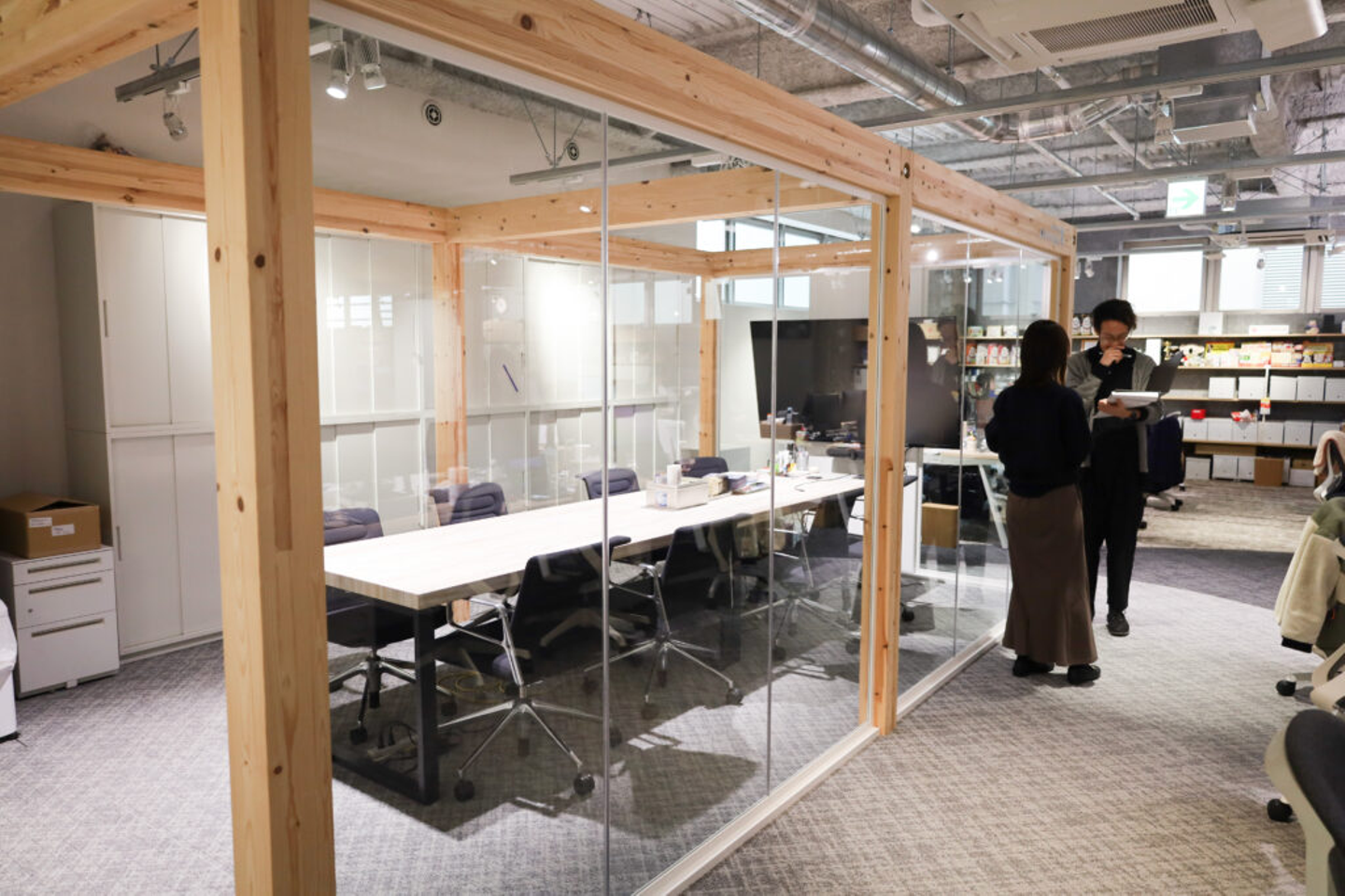 打ち合わせスペースがガラスの仕切りになっていて、印象に残る執務スペース。コミュニケーションがとりやすく、自由な発想が湧き出るようなオフィスをイメージして設計された空間です。