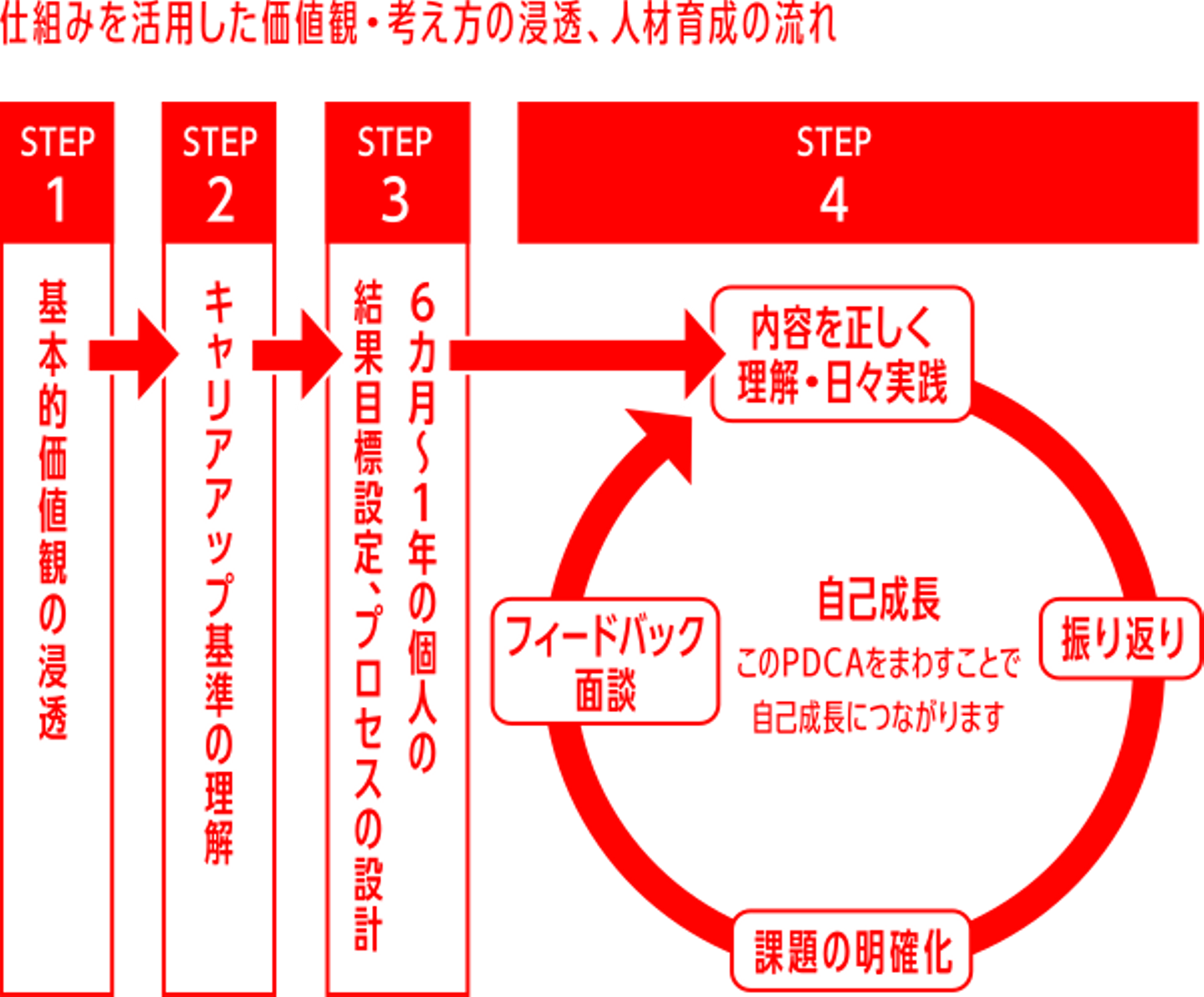 会社の基本的価値観を体現し、評価基準に沿ってキャリアアップしていくために、メンバー一人ひとりが6ヶ月〜1年間で達成したい目標およびプロセスを設計します。