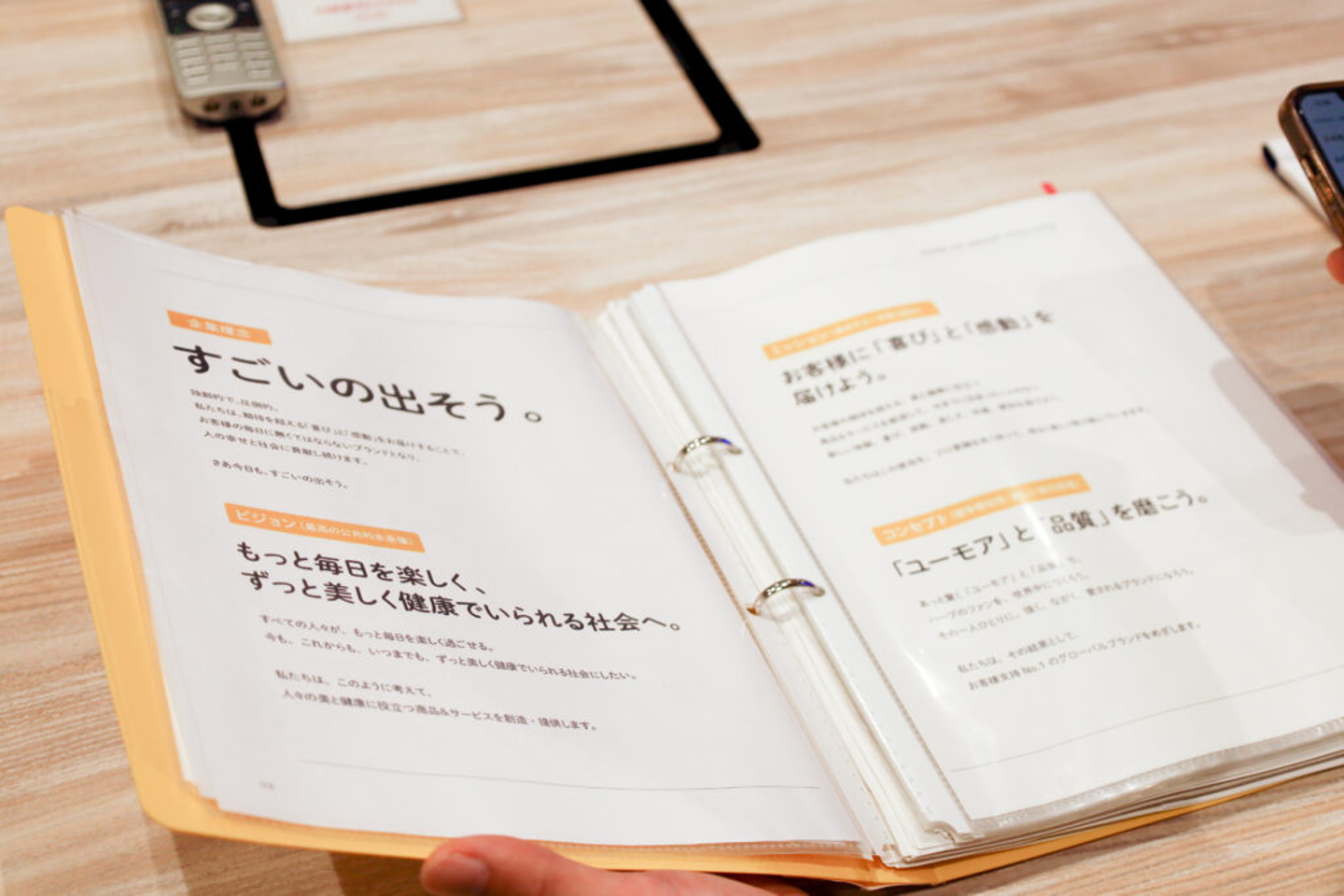 分厚いファイルが登場!この中には、会社の基本的価値観やクレド(行動指針)、キャリアアップ制度の詳細などがすべて格納されています。