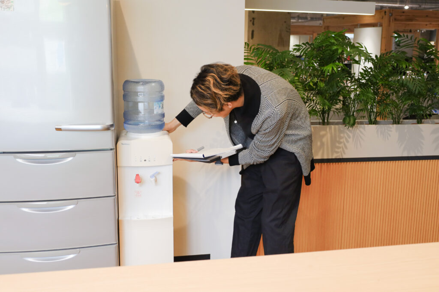 仕事で活用するコピー機の用紙やボールペン・メモ帳といった備品、休憩時に利用するウォーターサーバー、5階に設置してある自動販売機…。ハーブ健康本舗らしいデザインの設備が