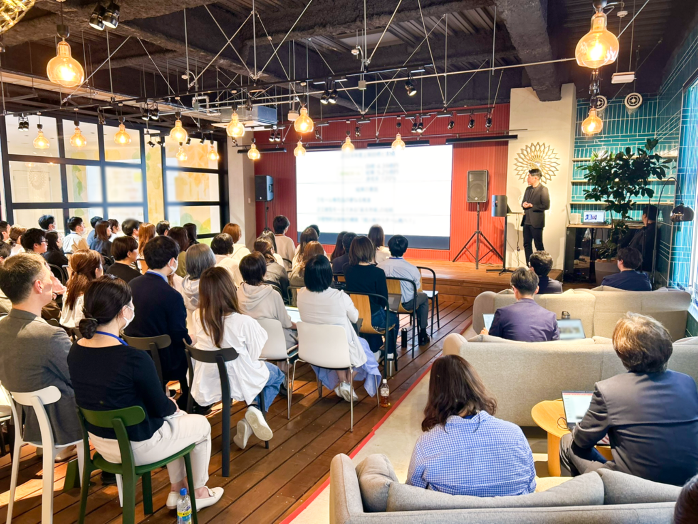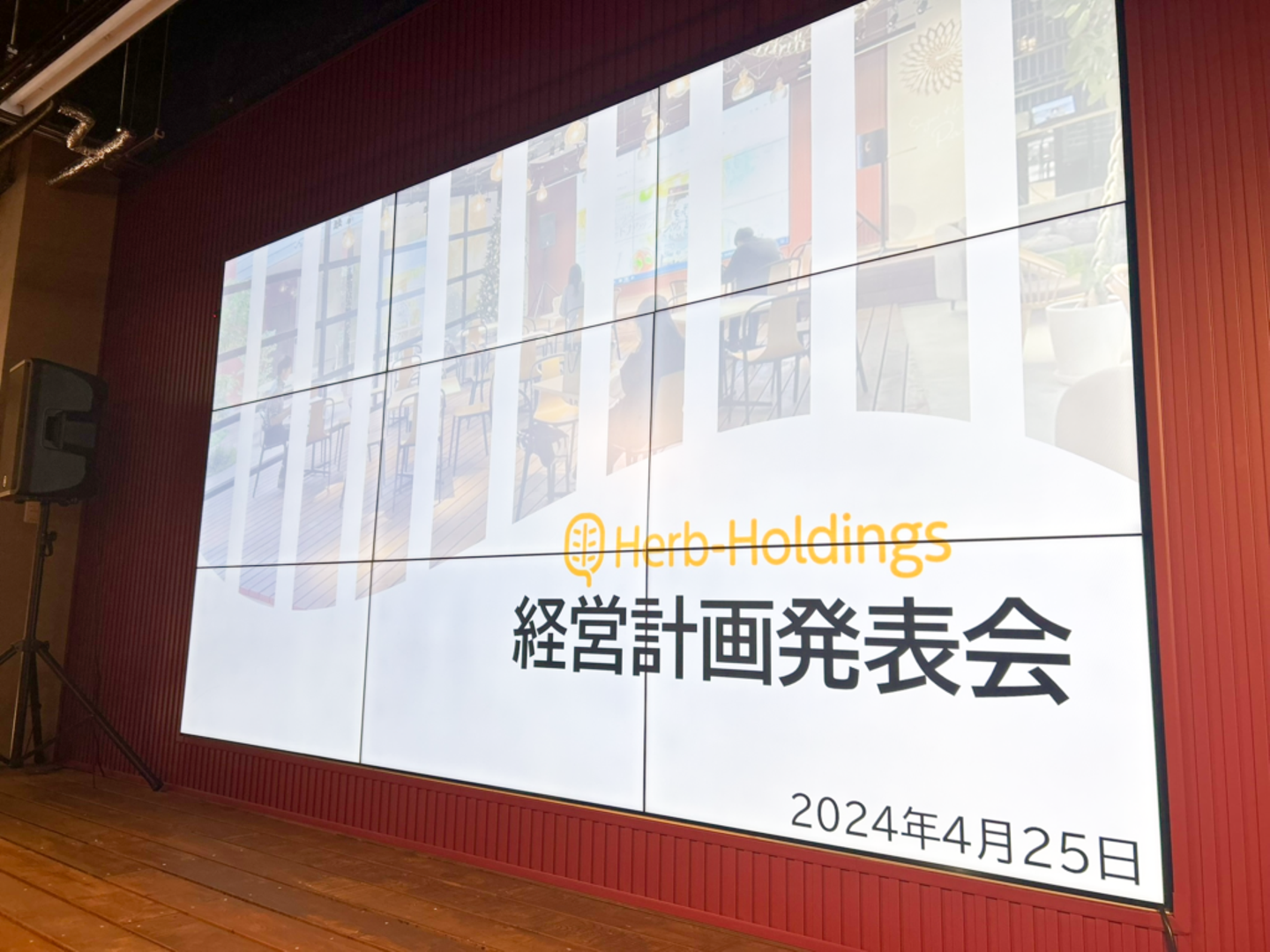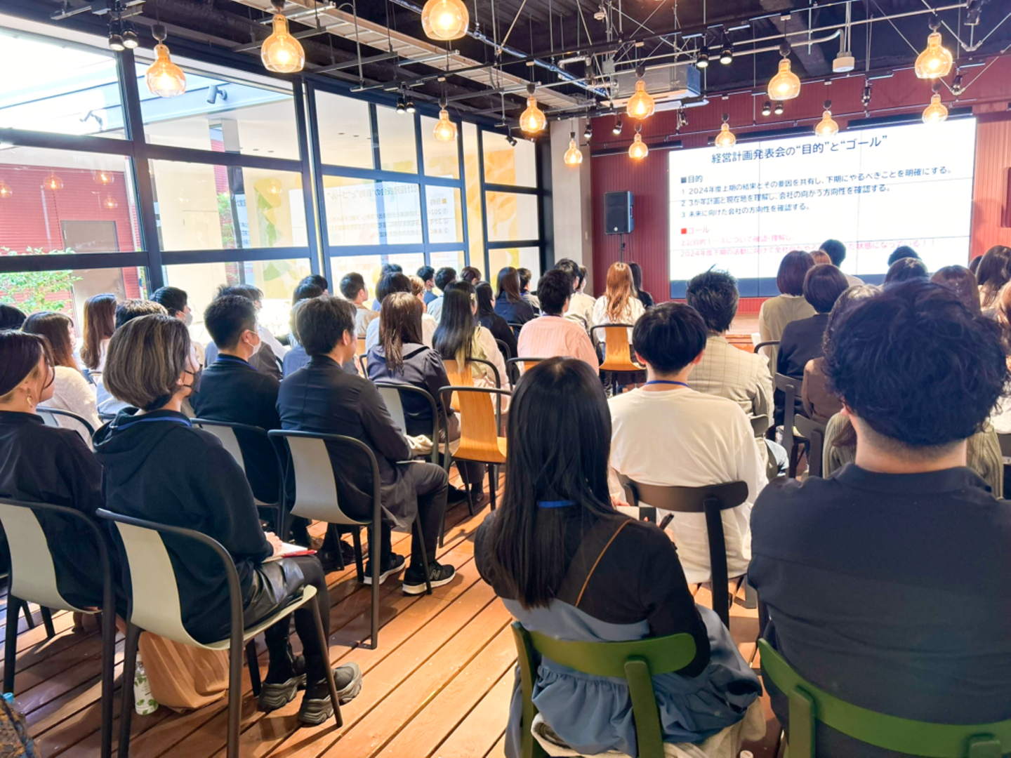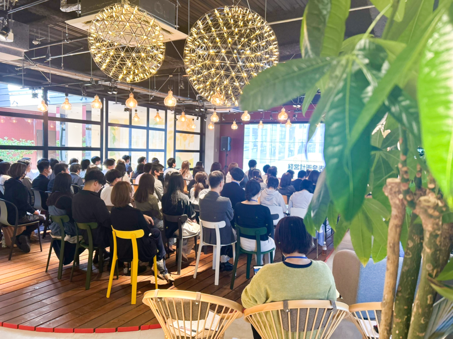 3ヶ年計画がスタートして最初の期が終わる4月末、全社員が5階・カフェスペースに集まり、経営計画発表会が開催されました。