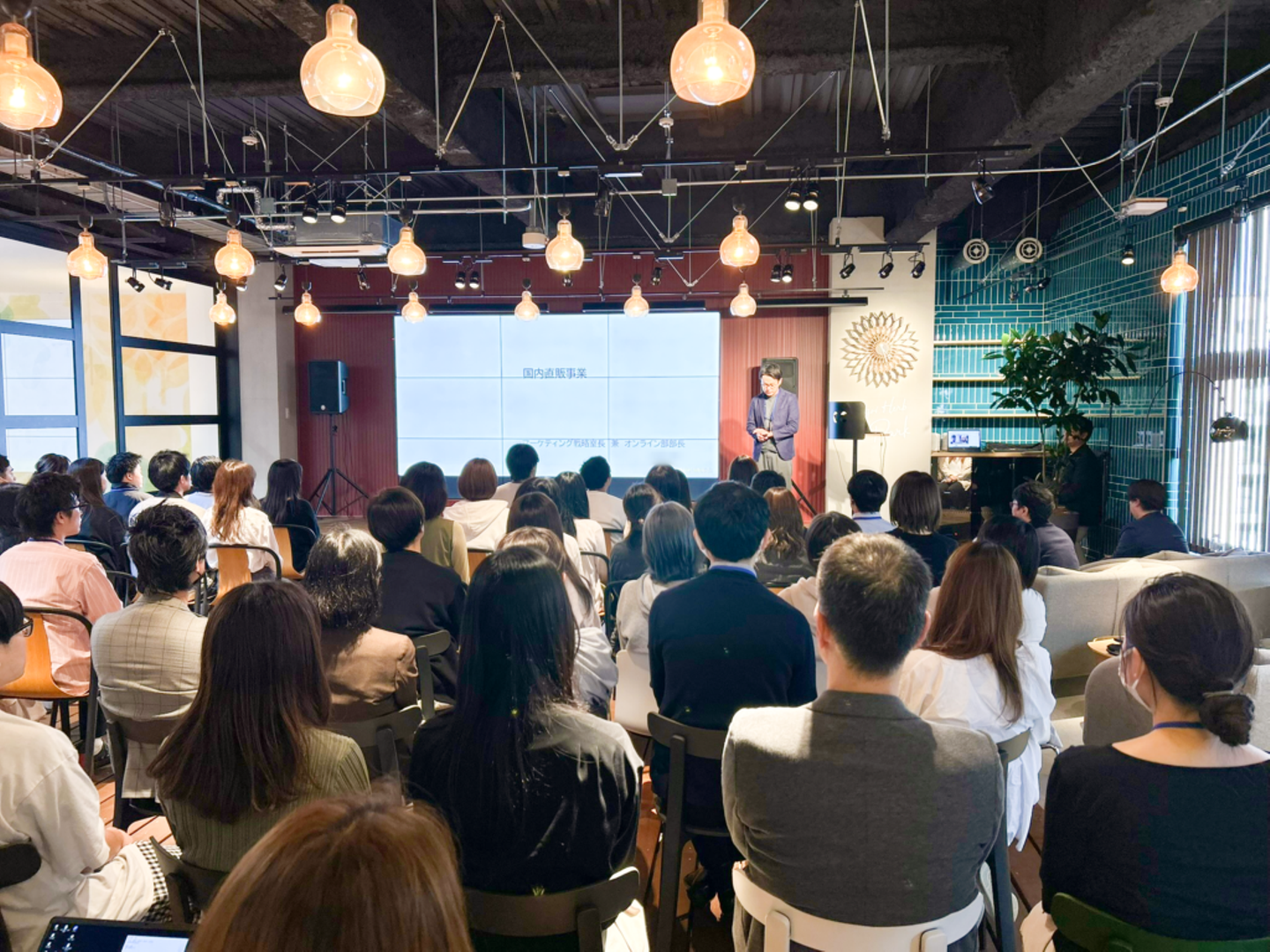 マーケティング事業・国内卸事業・ECモール事業・海外事業…。経営計画発表会では事業ごとにリーダーが登壇し、ここ半年のトピックスや目標に対する進捗、今後の課題を全社員に向けて共有します。