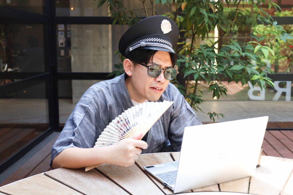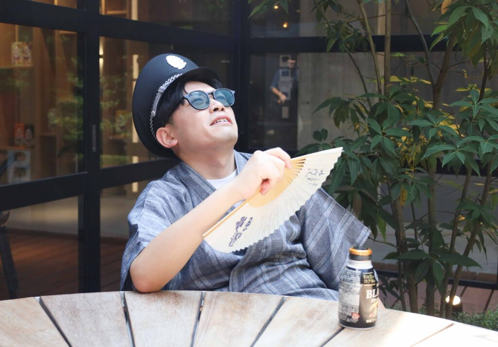 厳しい残暑を甚兵衛+扇子ひとつで乗り切る…常人には不可能な芸当だ 。