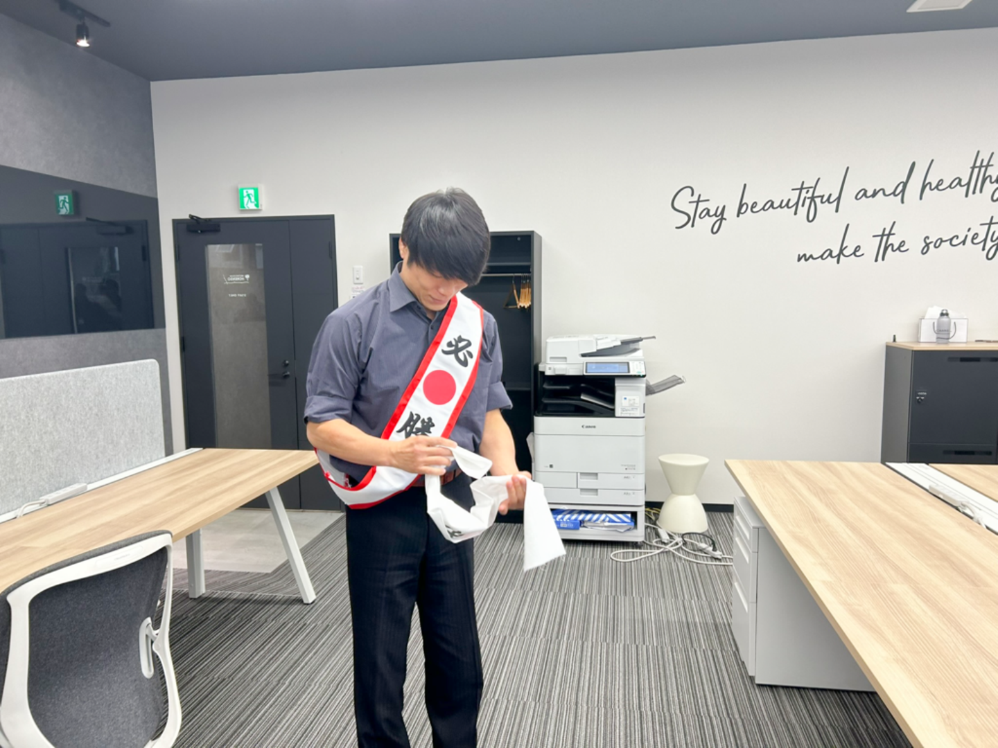 実は、メンバーが伊島に内緒で、八段試験に挑む伊島のプチ壮行会を用意していたんです。さっそく必勝ハチマキとタスキを身につける伊島。