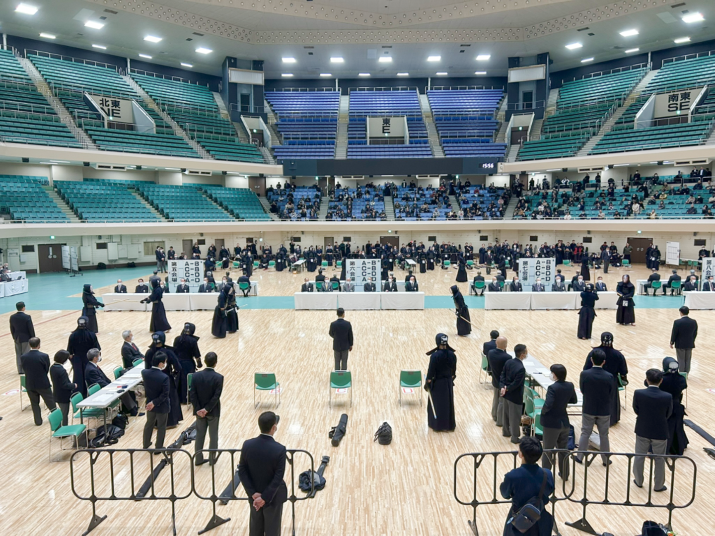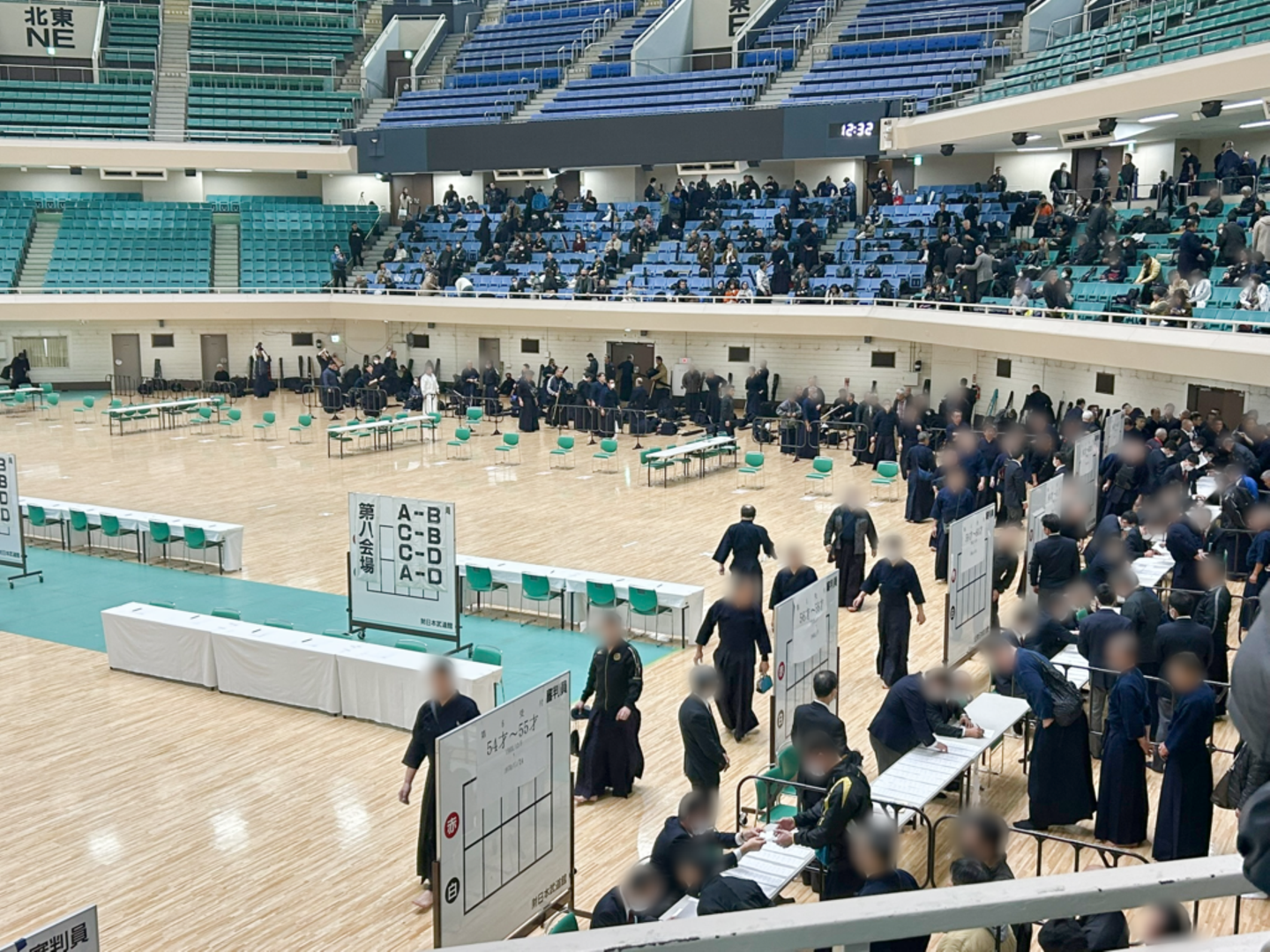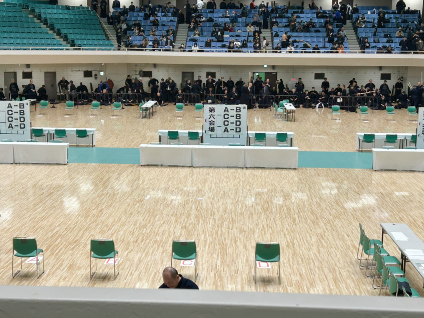 八段の審査は、武道場を8つの審査ブロックにわけて行われました。各ブロックに審判と、試験の審査員が6名並んでいます。