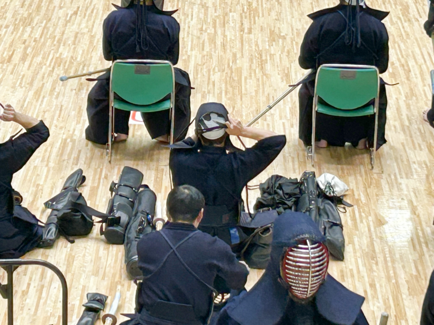 試験は4人の選手の総当たり戦。各ブロックに集まった選手たちは、目の前の選手たちの試合展開を見守りつつ、防具を身につけながら静かに出番を待ちます。