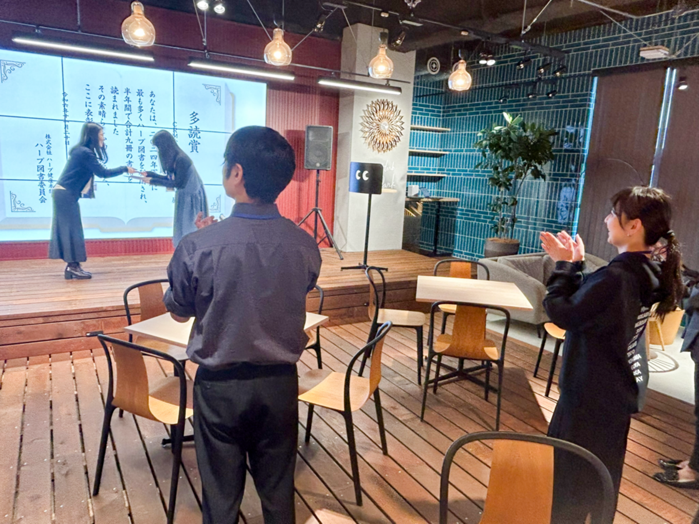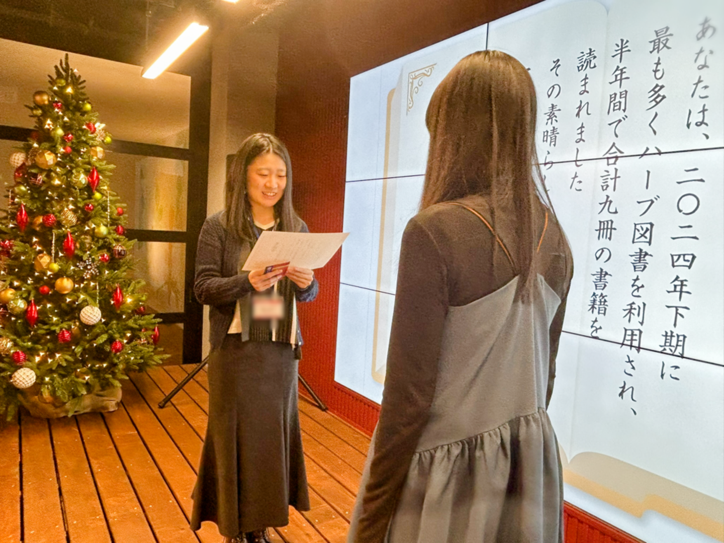 2024年の12月、記念すべき第1発目の多読賞をゲットしたメンバーを呼んで、5階のステージにて表彰!図書委員会メンバーみんなでお祝いしました。
