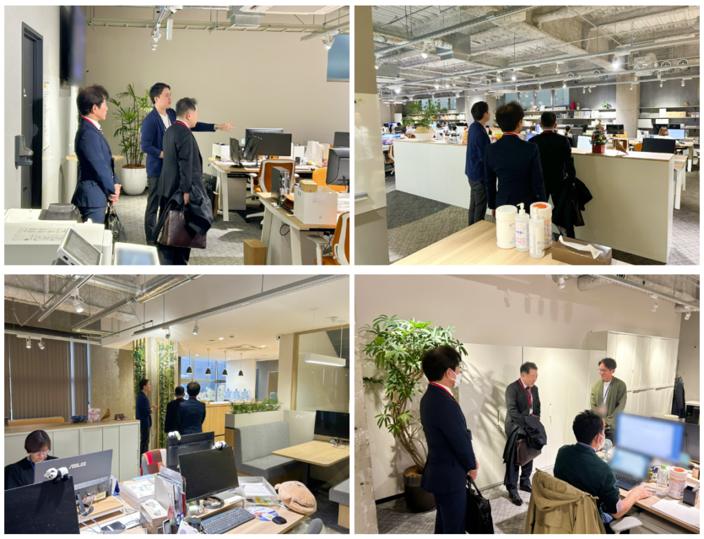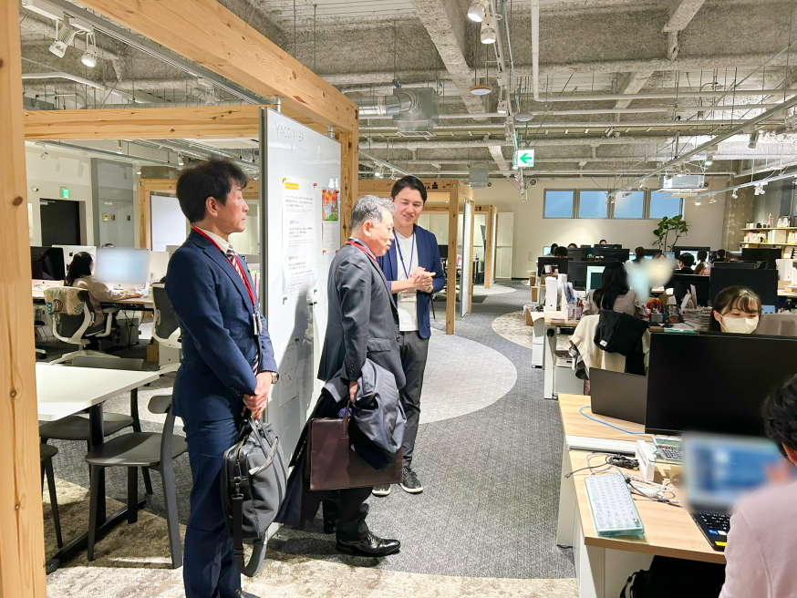 3〜4階の執務スペースを回りつつ、各部署がどのような仕事をしているのか、会社を代表して人事部の高原が説明しました。九州大学出身のメンバーと会話が弾む場面も!