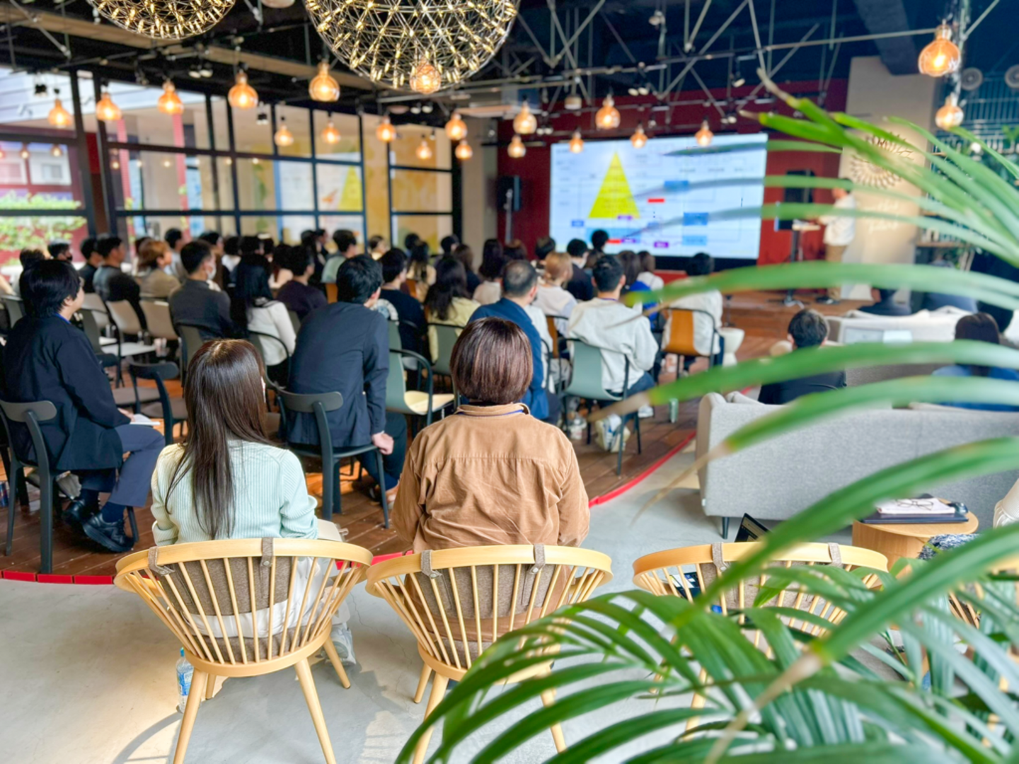 メンバー全員で気持ちを揃えて、目標達成に向け前進したいという思いで、半年に1回開催している経営計画発表会。全メンバー参加型のミーティングで、代表の永松をはじめ、各事業部のリーダーが現状の進捗報告と、来期の目標・取組を発表します。