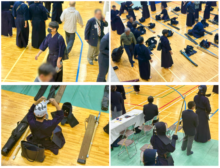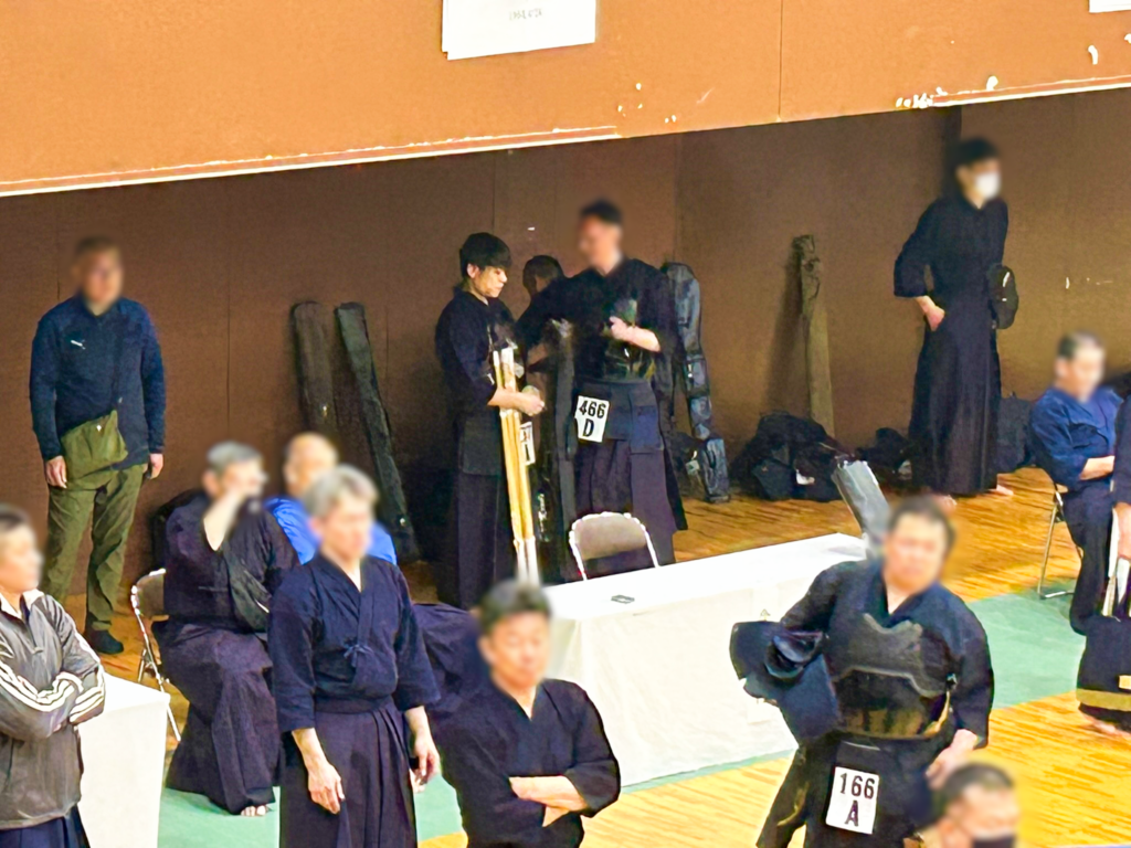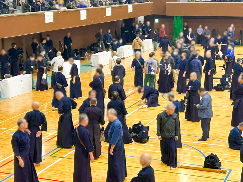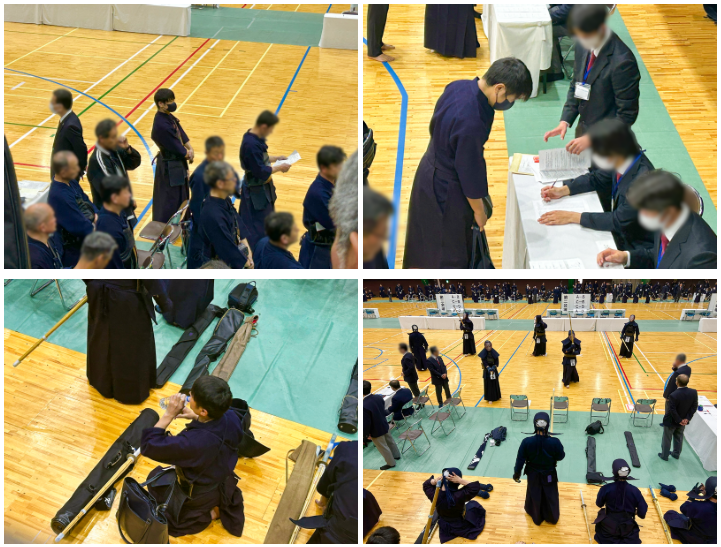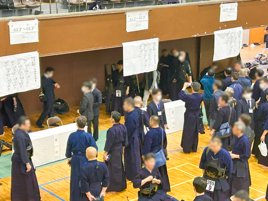 65歳以上の参加者は午前の部に、65歳未満の参加者は午後の部に割り振られました。順番に名前を呼ばれ、受付を済ませる剣士たち。試合の順番は受付後に発表され、自分の試験がはじまるまでは各自身体を動かしたり準備を済ませたりして過ごします。