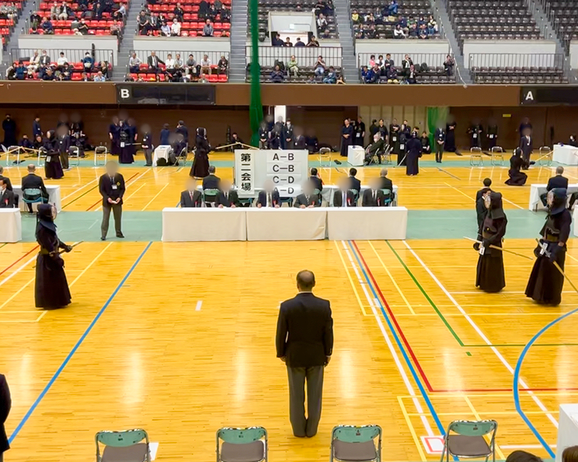 体育館内を8つの審査ブロックにわけて行われる八段審査では、審査員6名の鋭い視線が向けられる中、淡々と試合が進んでいきます。