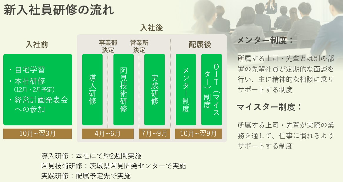 技術研修をしっかりと2か月間行い、基礎を築くことができますので、文理問わず、配属先で活躍できるようになります!