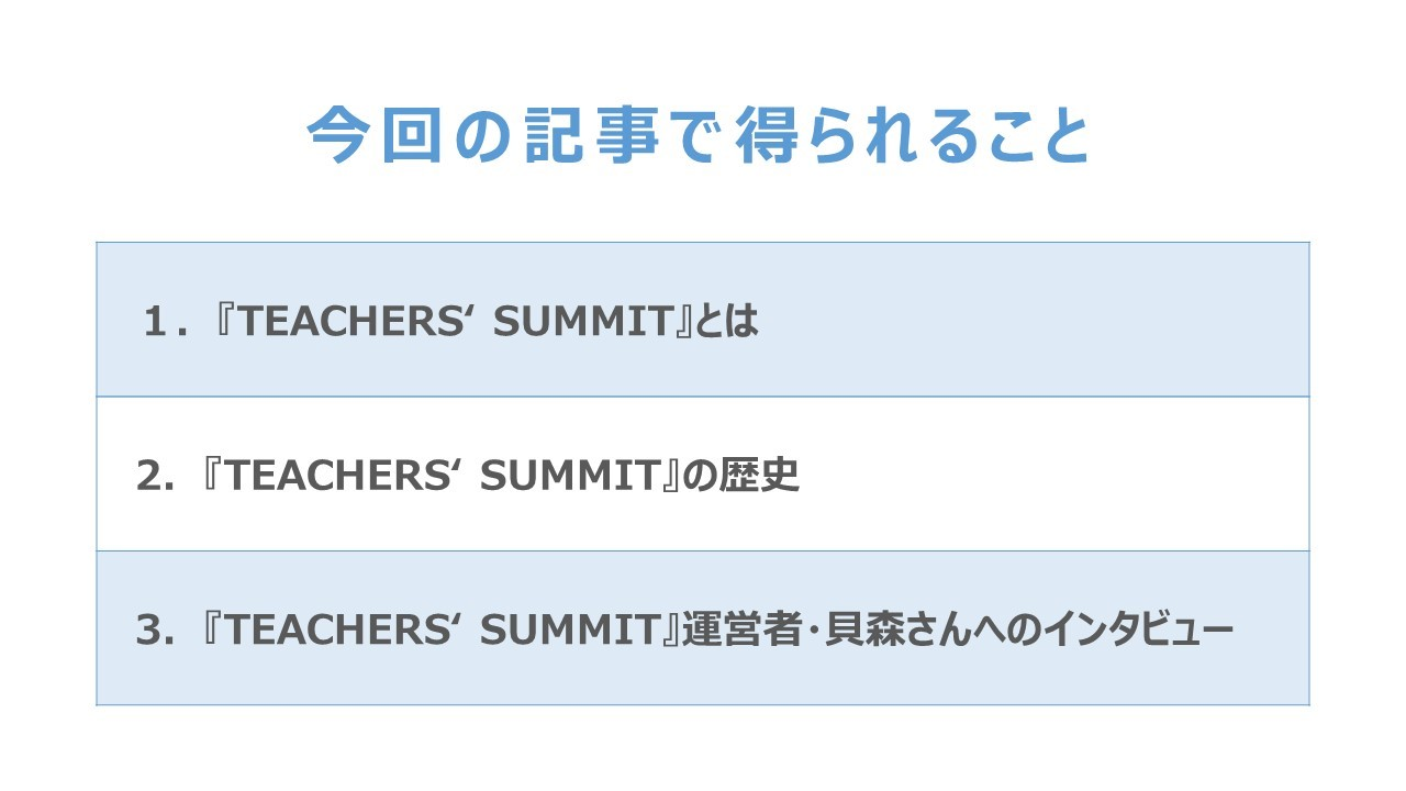 そこで今回は、この「TEACHERS’ SUMMIT」大総括会 について詳しく紹介していきます!「TEACHERS’ SUMMIT」大総括会 がどのようなものなのか、どのような経緯で生まれたのかということについてお伝えします!
