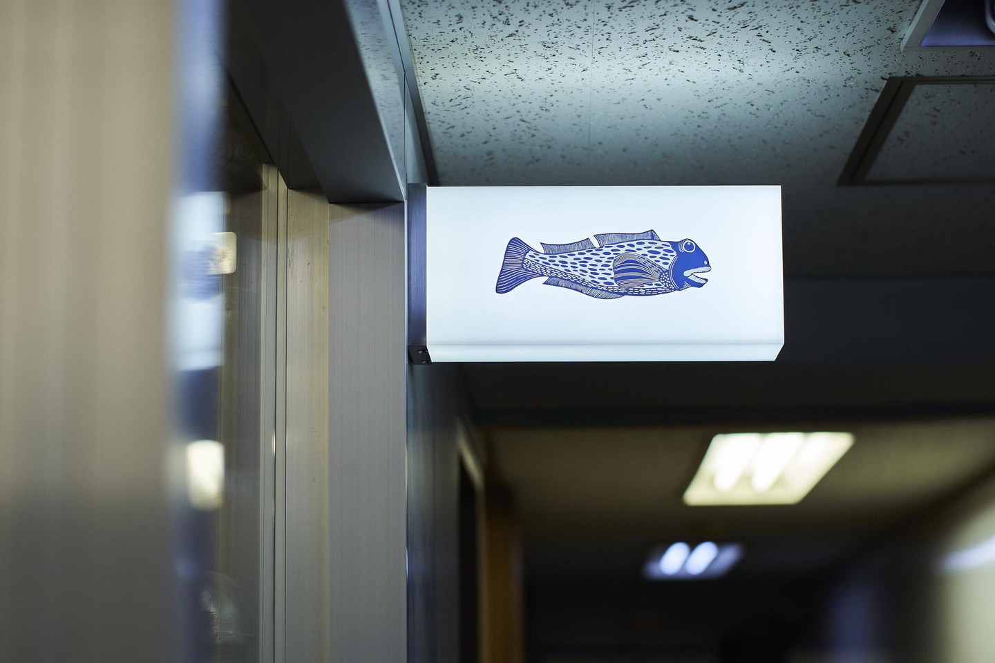 店舗は雑居ビルの奥の方の、なかなか人目にはつきにくい場所にあります。ならば、その逆境を強みに変えて、パン工場のような佇まいにしてはどうかとセントラルキッチンをつくり、工場直売のようなイメージで店舗を開発。モチーフの青い魚が光る看板は、ビル内の雰囲気と相性ばっちりですよね。