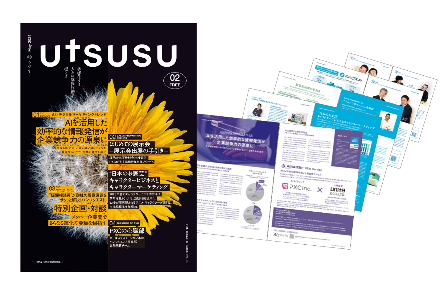 Pioneer of AI/SPを標榜し、セールスプロモーション業界のDXを牽引するPXC株式会社(本社:東京都台東区、代表取締役社長:菅野健一)は、セールスプロモーション業界を取り巻く情報や弊社のサービスおよび実績に関する情報などを掲載した、定期情報誌「UTSUSU(うつす)vol.2」を発刊しました。