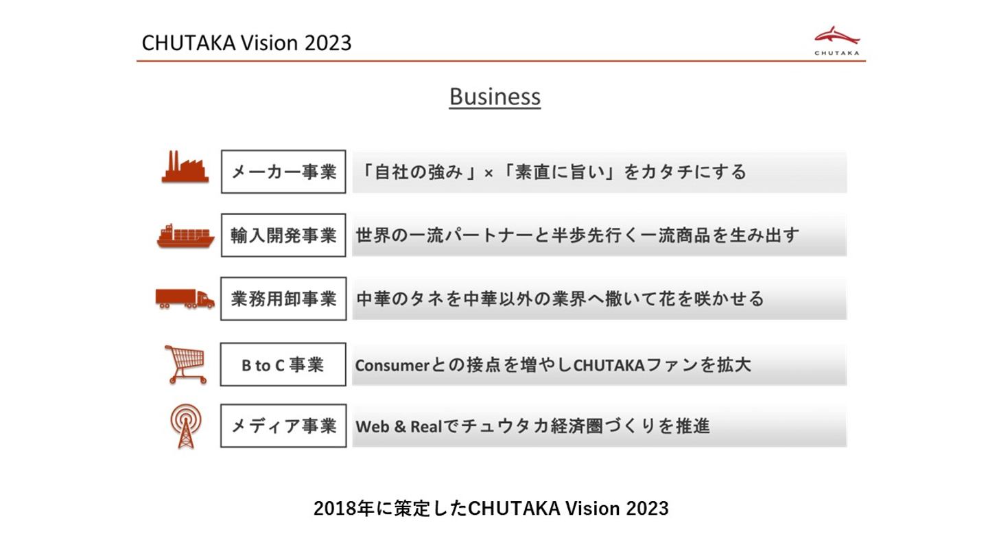 2018年に「CHUTAKA Vison 2023」という、当時から5年後である2023年にはこんな立場を確立していたいという目標を設定した。その中で、メーカー事業は順調に対外的にもメーカー的立場として認識してもらえるようになっているが、その他のところも推し進めていきます。コロナで足踏みしてしまったことも踏まえ、あと5年かけてこの5大事業をそれぞれ売上の大小ではなく、客観的に誰もが認める品質のものを取り扱えている、商品でも、情報でも、その分野で一番素晴らしいと思われる作り手に認められるような実力がある状態…つまりは一流っていうことなんだけど。そうなるように育て上げていきたい。