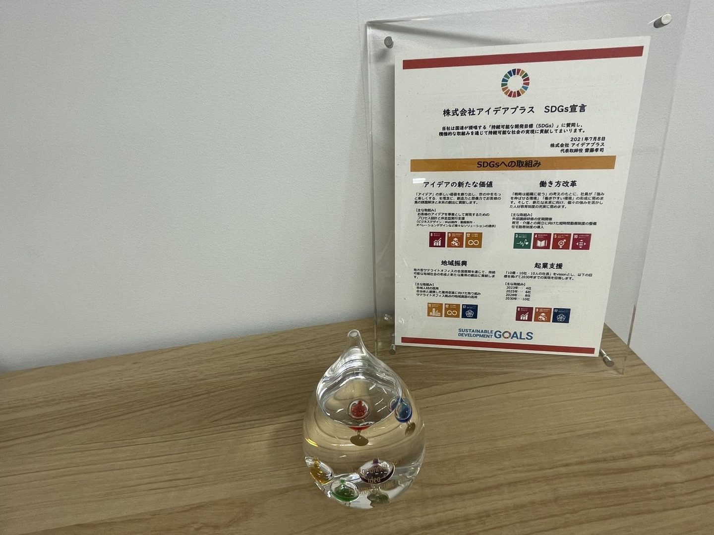 来社された方、みんなの目に届くようにアイデアプラスSDGs宣言を掲げております。