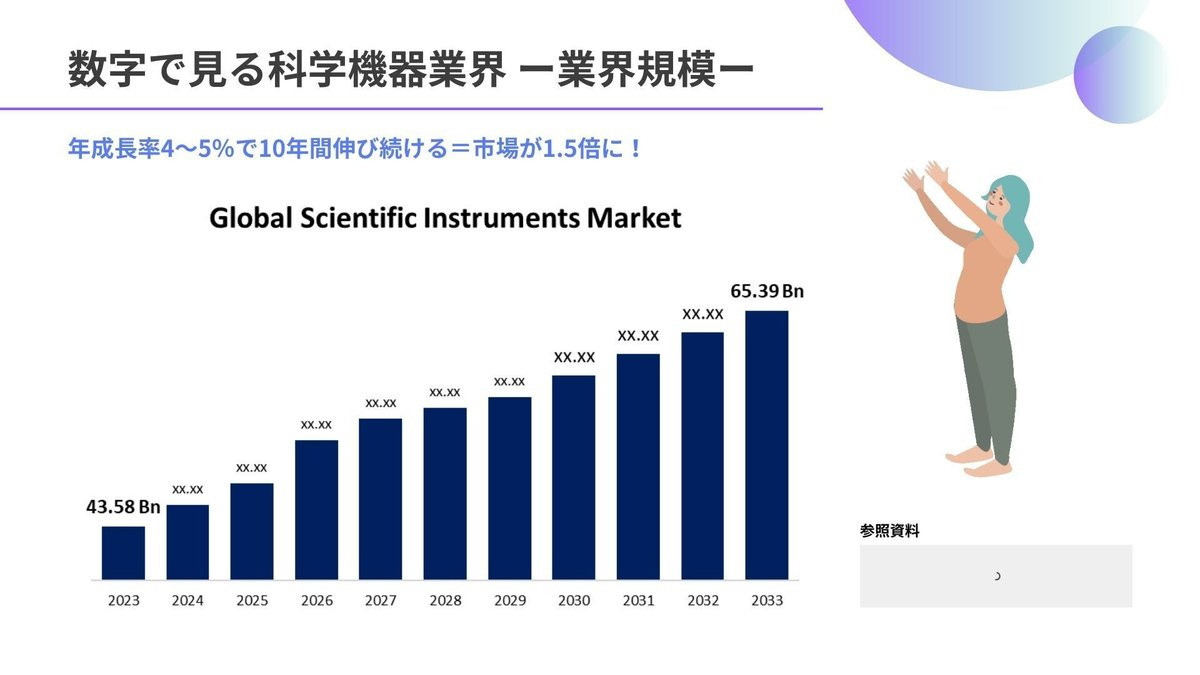 科学機器業界は、今、世界的に勢いのあるマーケットです。世界の市場規模は数兆円に上り、今後も毎年5〜7%のペースで安定して成長していくと予測されています。なぜなら、医療、環境、食品、半導体など、ありとあらゆる分野で「分析・計測」のニーズが高まっているからです。たとえば、新しい薬を開発したり、食品の安全を徹底的に守ったりするためには、高性能な科学機器が欠かせません。この需要は今後も安定して伸び続け、市場はさらに拡大していくでしょう。