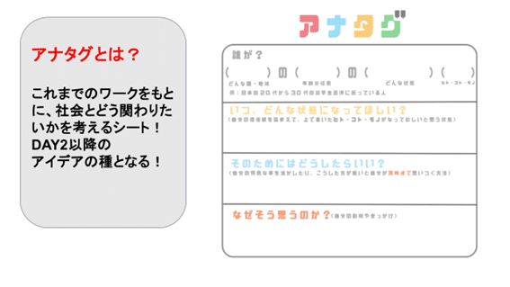 最後には、「じぶんベース」をもとに、ビジネスアイデアの種となる「アナタグ」を作成。プログラム2日目に向けて、自分と社会の接点を考えました。
