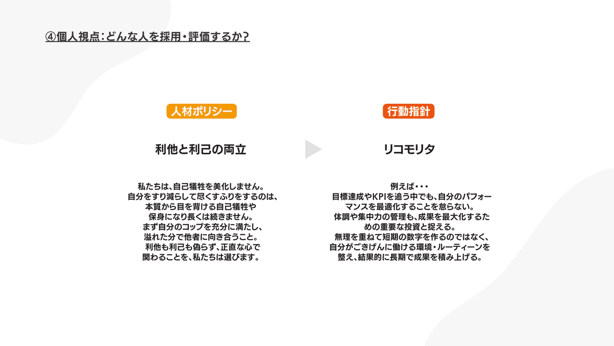 私たちは、「利己と利他」の両立を目指すと書いていますが、行動指針としては、一旦「自分自身」に寄せて考えることを重視しています。まず自分自身のために成長し、学びましょう、と。