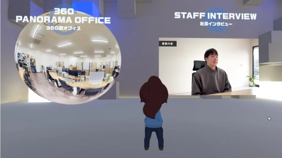 当社のブースでは、社内の雰囲気や働く魅力を360°映像や社員インタビューでご紹介しています。ぜひ仮想空間でご体験ください。