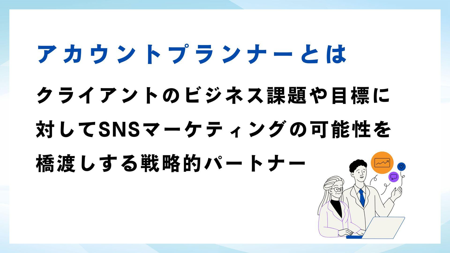 アカウントプランナーは、SNSを活用したマーケティング施策を通じて、クライアントのビジネス課題を解決するための最適な提案を行い、信頼関係を築きながら新規契約の獲得につなげることを目的としています!