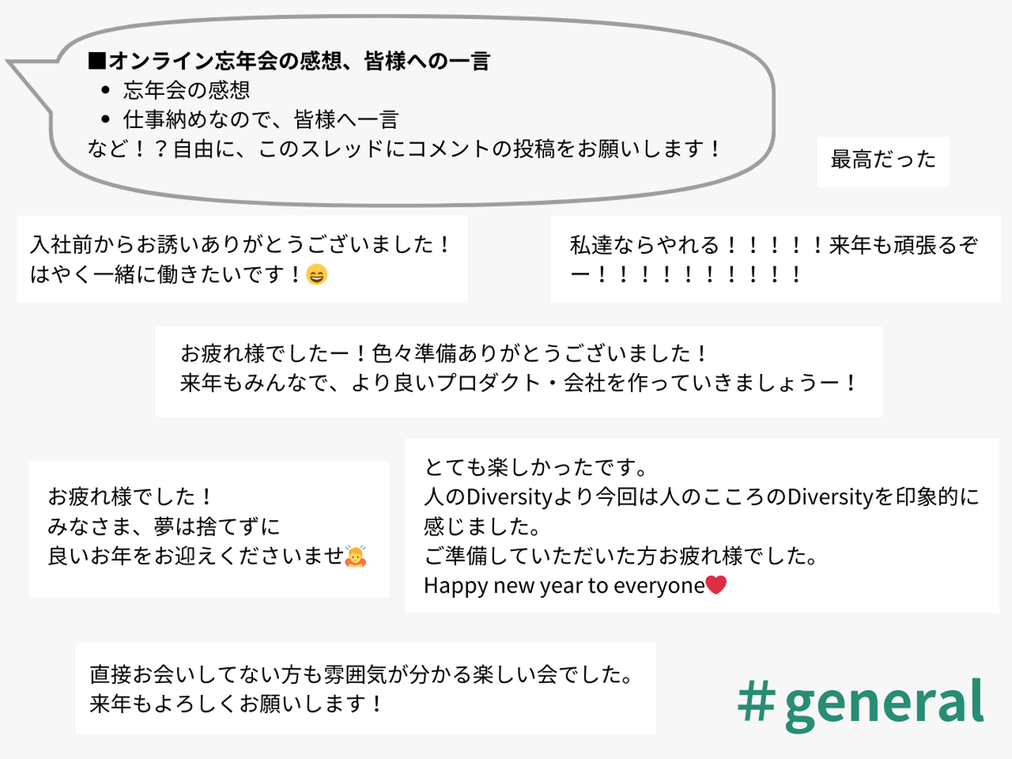 そこで、“知ること”(ネットワーク構築)を目的としたオンライン忘年会を開催しました。フルリモートの中で一度も話したことのない新入社員に仕事を依頼するよりは、人となりをわかっている方が依頼がしやすいですし、会社として最高速度を出すためのチーム作りの一番最初のきっかけも“お互いを知ること”なんです。
