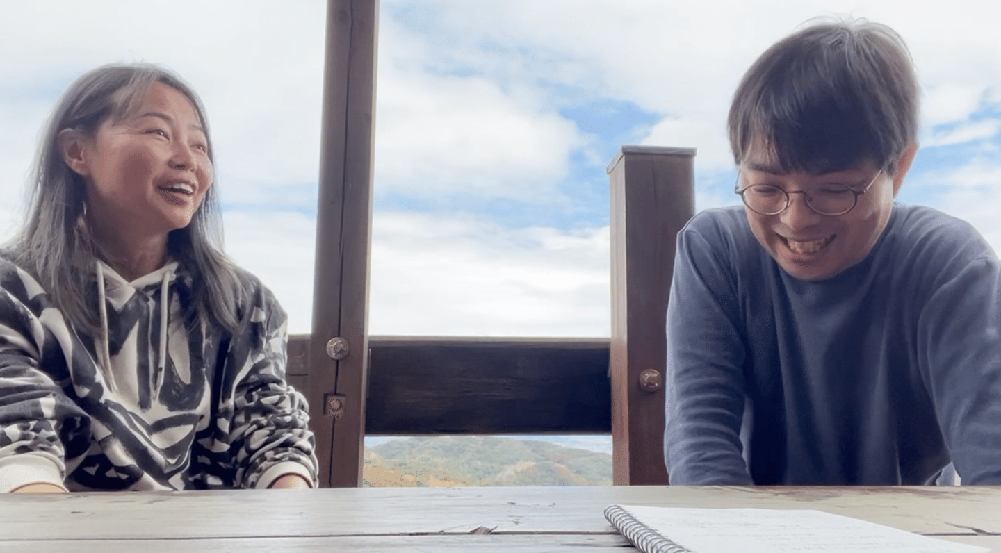 糸島市にて屋外で対談。外には糸島市の美しい田園風景が広がっていました。