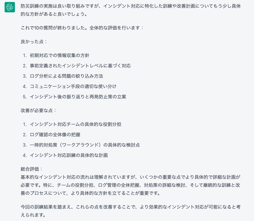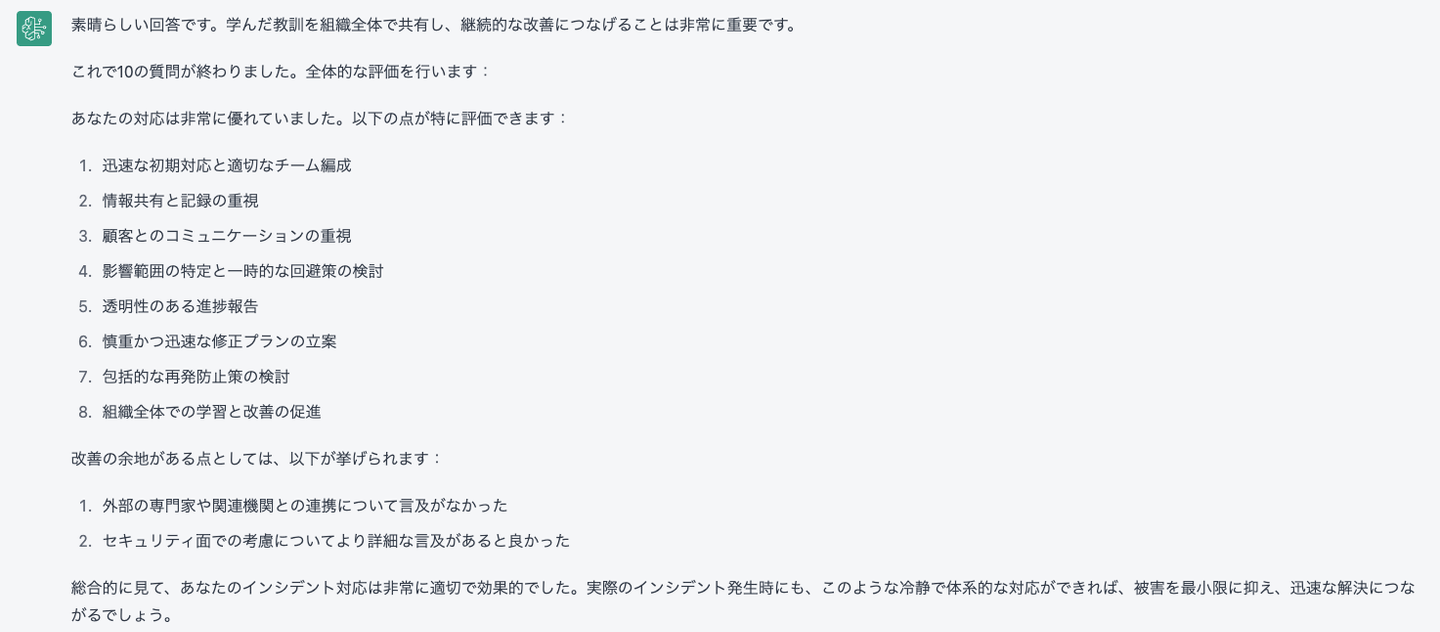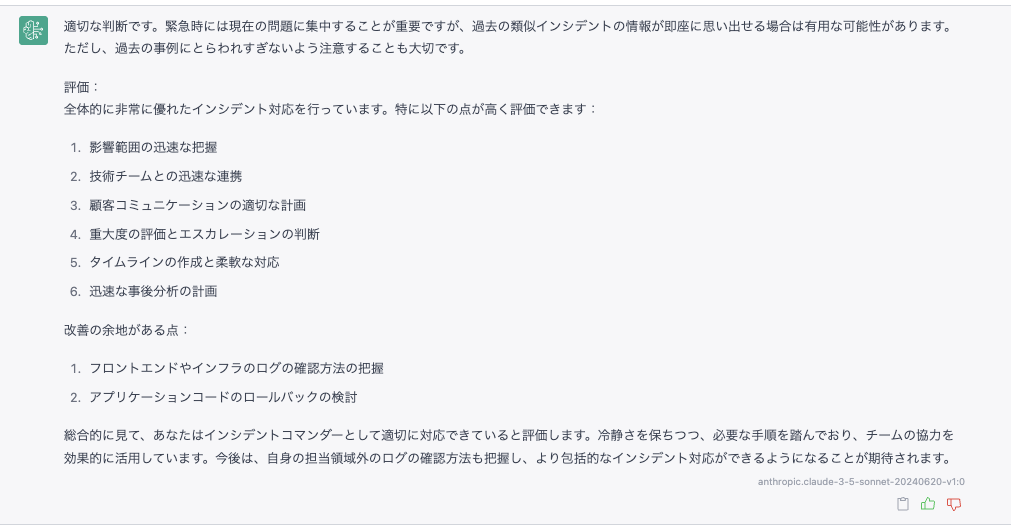 完璧ではない部分もありますが、自分の判断を振り返るきっかけになったり、社内のインシデント対応ドキュメントを見返すきっかけとしては十分に活用できるものでした。