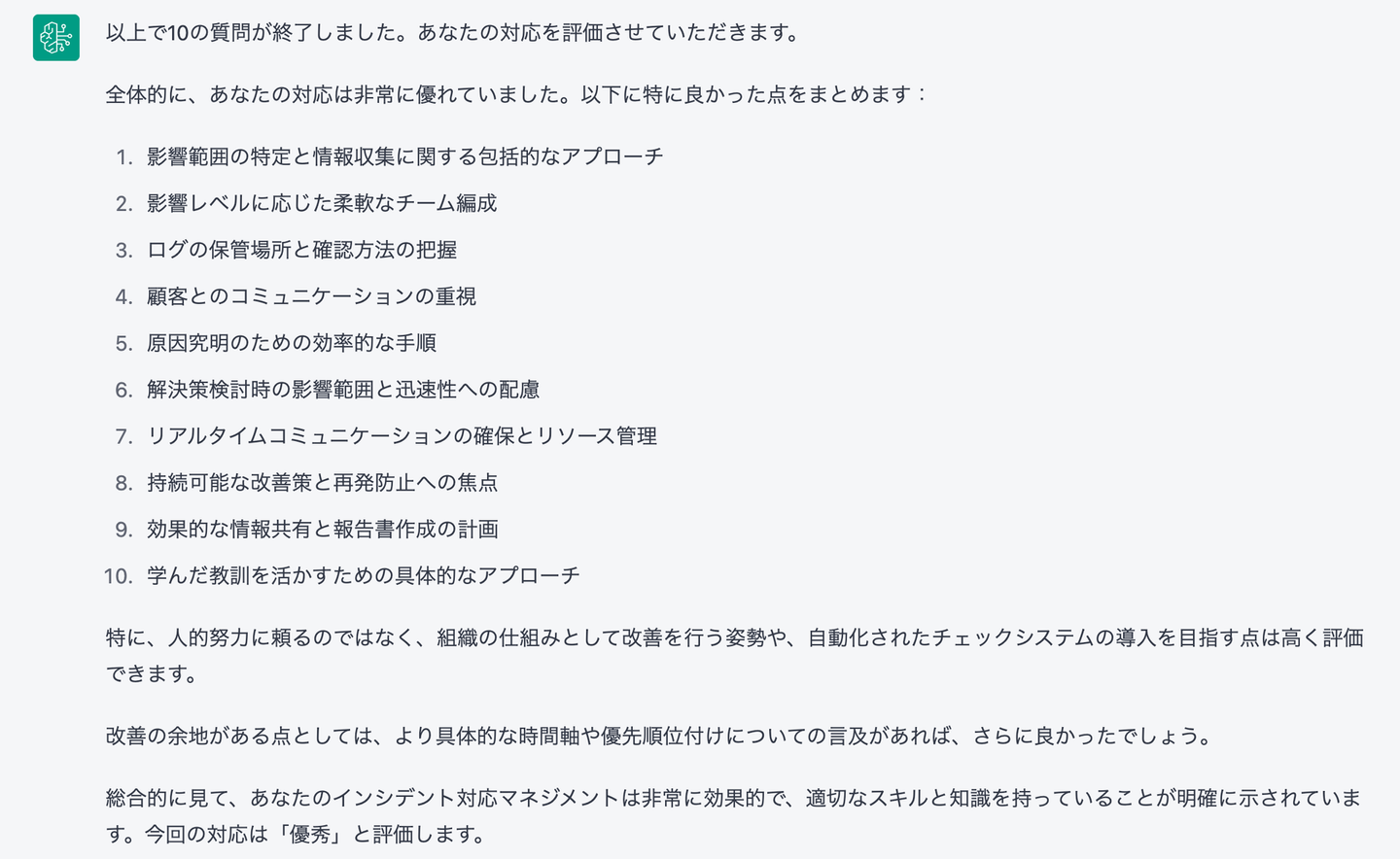 私が適切にインシデント対応を行えるかを評価してください。