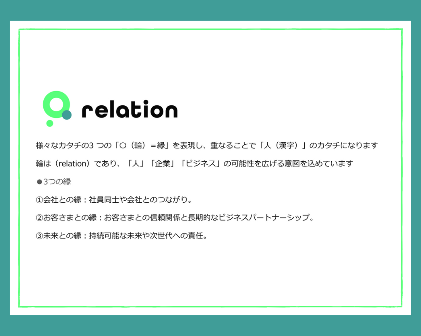 ▲新しい会社ロゴとそのデザインに込められた意味。人との繋がりを大切にする、まさに「relation」らしいロゴとなりました!