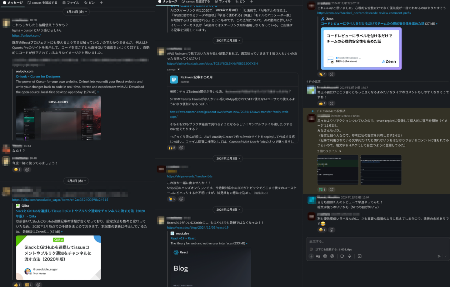 研修を受けさせてくれたり、テック系のイベントにも積極的に参加させてもらえたり(ニューヨークやラスベガスでのイベントにも参加!)、日々slackでの技術的な情報交換なども活発で和気藹々と技術力をあげていっています↓(slackの情報交換チャンネルの様子。)