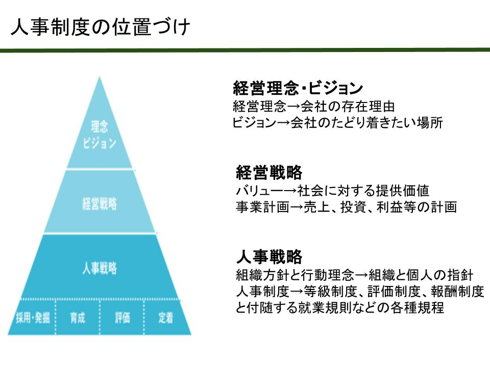 当社では人事制度を以下の表のように位置づけています。経営理念が最上位概念であり、経営戦略から人事戦略となり、人事制度は「等級制度」「評価制度」「報酬制度」を中核として策定しています。公正な処遇と報酬の実現が人事制度の位置づけです。これらに働くうえで基本的な約束事を定めた就業規則と勤怠制度、働きやすい環境にするためのリモートワークや福利厚生に関する諸規程が付随しています。今後は組織の成長に合わせて、制度も成長させる予定です。
