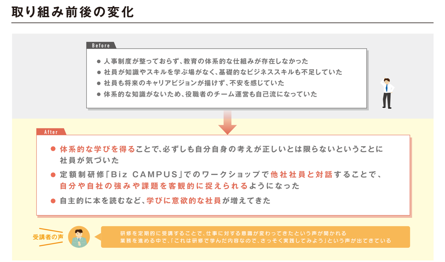 オールディファレントでは、社員の成長を促進するための新たな教育体系を構築し、「Biz CAMPUS」という定額制研修プログラムを導入しました。