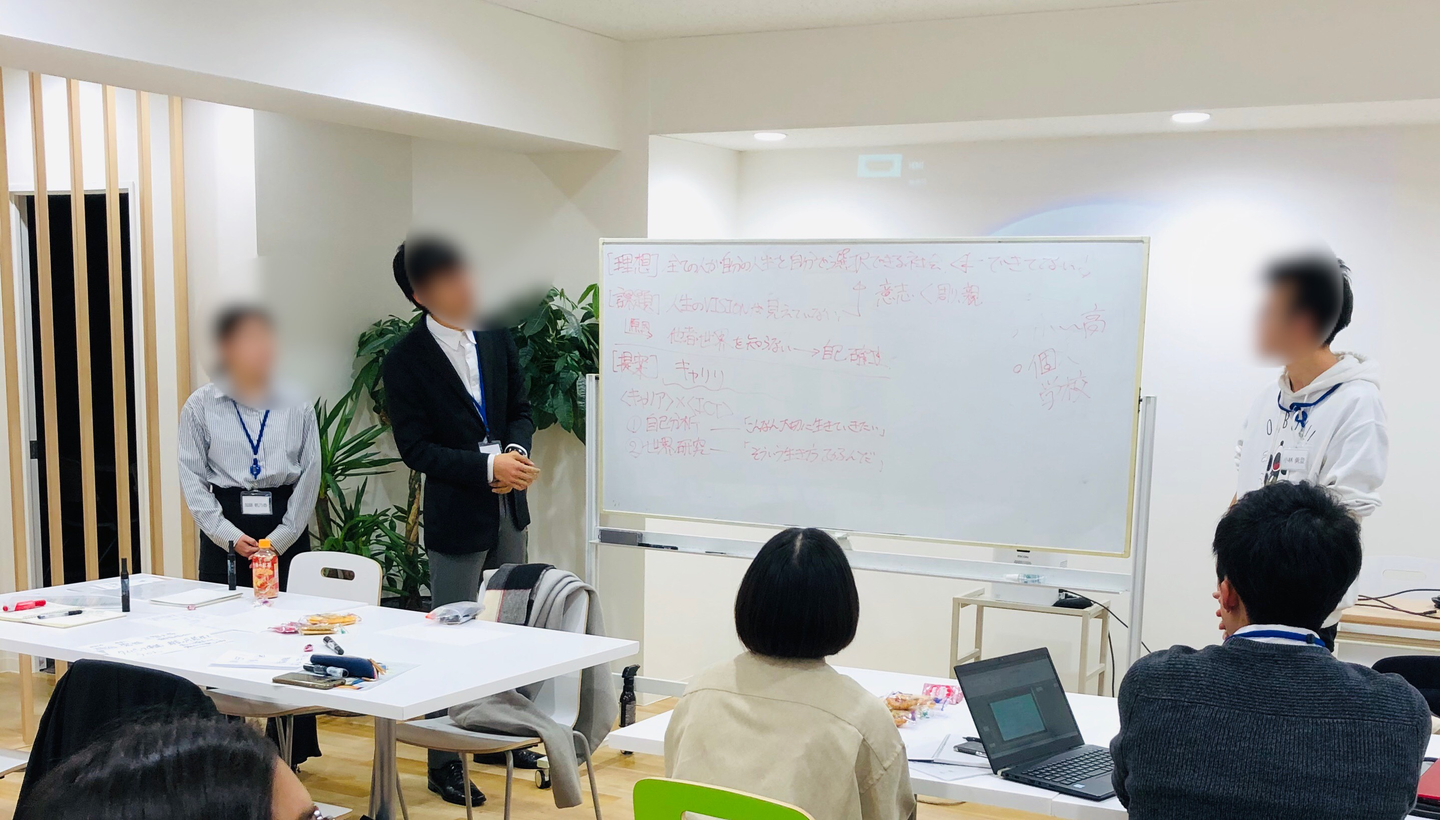メインであるグループワークは、日頃感じる社会課題や教育課題を出発点として、それを解決する新規事業を提案しよう、というテーマで行いました。テーマ発表後には社員より、「なにかアイデアが浮かんだら、顕在化している課題を見えなくする提案なのか、根本的な課題自体をなくす提案なのかをよく考えてほしい。課題を掘り下げていくと、根本的な解決策が見えるかもしれない。」とのアドバイスがあり、グループワークがスタートしました。