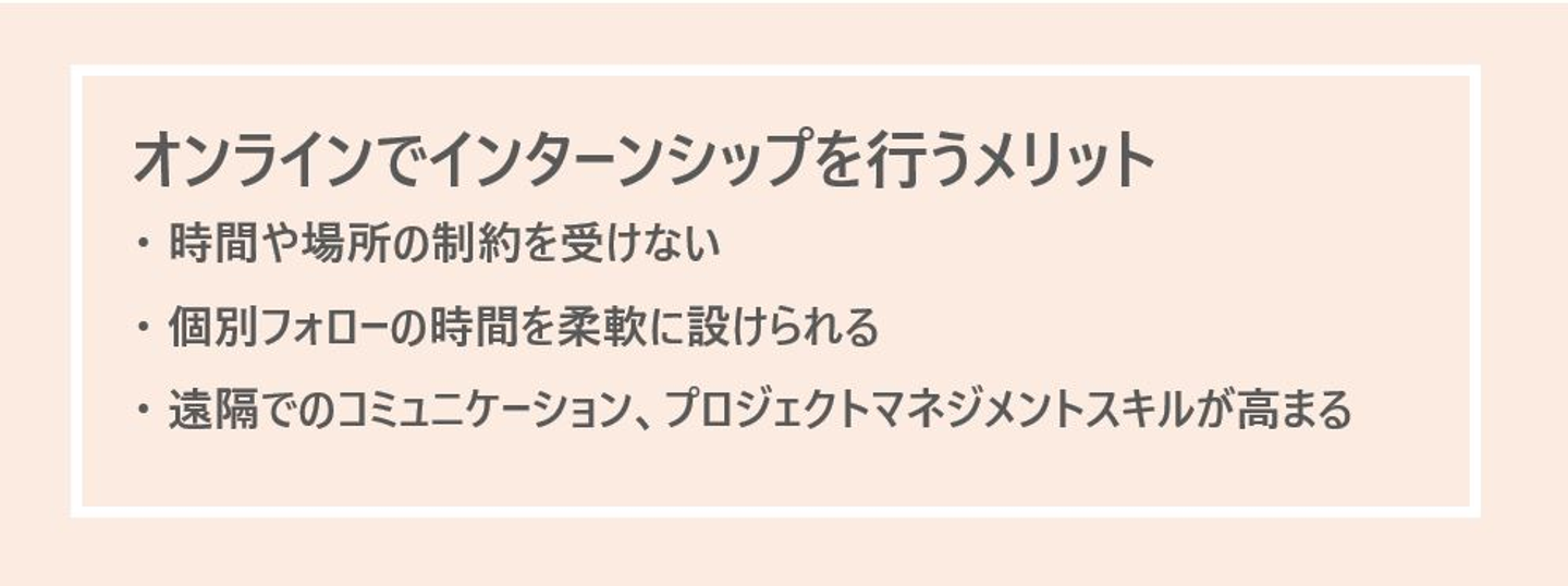 あと、何と言っても遠隔で仕事を進めるコミュニケーションスキルが身につくのが、オンラインインターンの醍醐味です。オンラインで各メンバーの意図や心情を汲み、意思疎通していくスキルや、メンバーの進捗を管理し、適切なタイミングで先輩社員に相談・報告をしたり、そのためにわかりやすい方法を考えたりするスキルは、これからの時代に仕事をしていくうえで必須のものです。入社前に測り、鍛えることの難しいオンラインコミュニケーション・プロジェクトマネジメントスキルを身につけていただけたことは、プログラムの高い満足度につながりました。