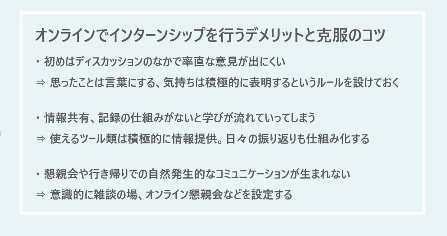 加えて、従来であれば、インターンの時間帯が夕方であれば、終了後にそのまま誘い合って呑みに!ということもできましたが、それができないために自然発生的な雑談コミュニケーションの場は、意識的に作らないといけないと感じます。