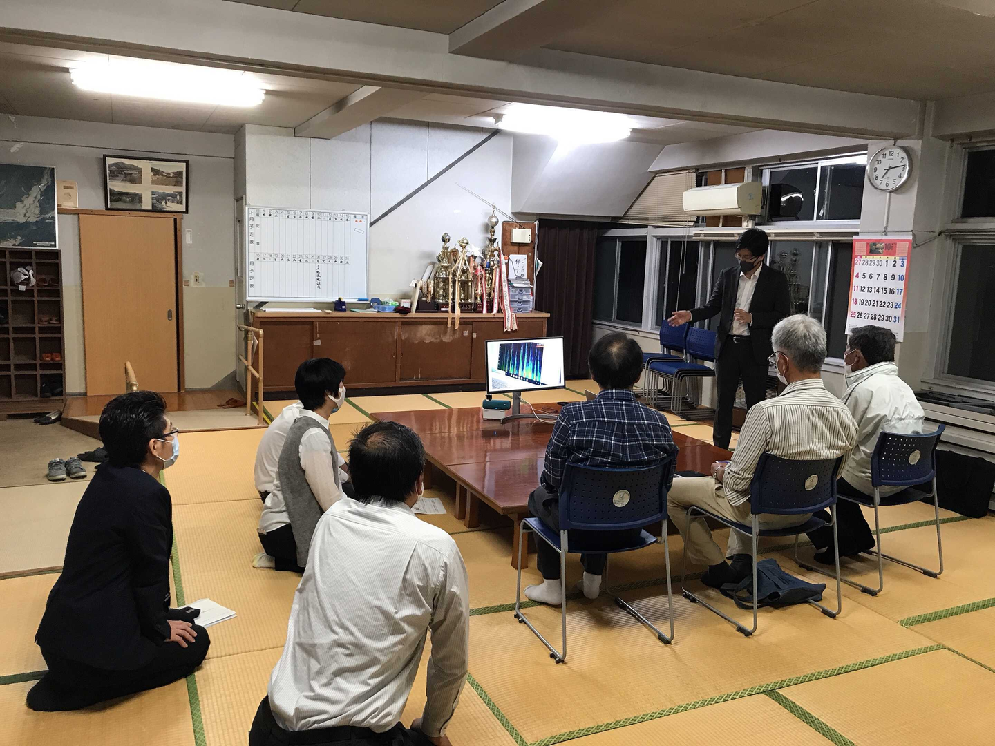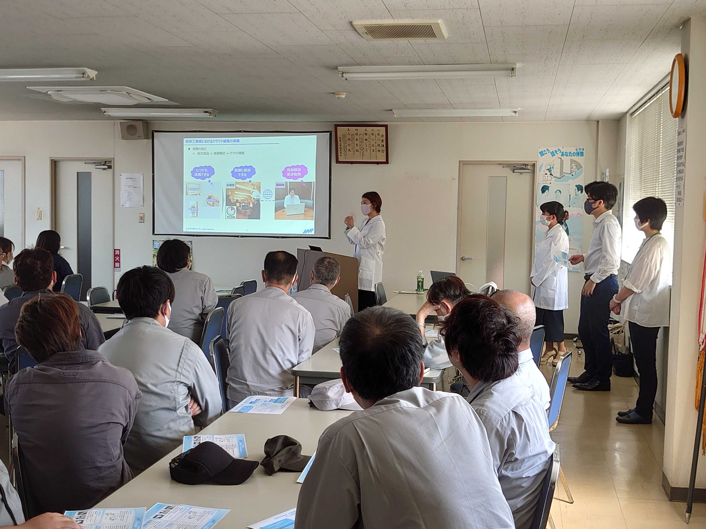 遠隔聴診プロジェクトの一環として進めている当社のクラウド健進®(※)を、水俣市の企業様で実施することを説明している様子です。当日は当社の代表取締役CEOで医師でもある小川や、看護師安永、管理栄養士横山が、会社紹介やクラウド健進®について説明をしました。