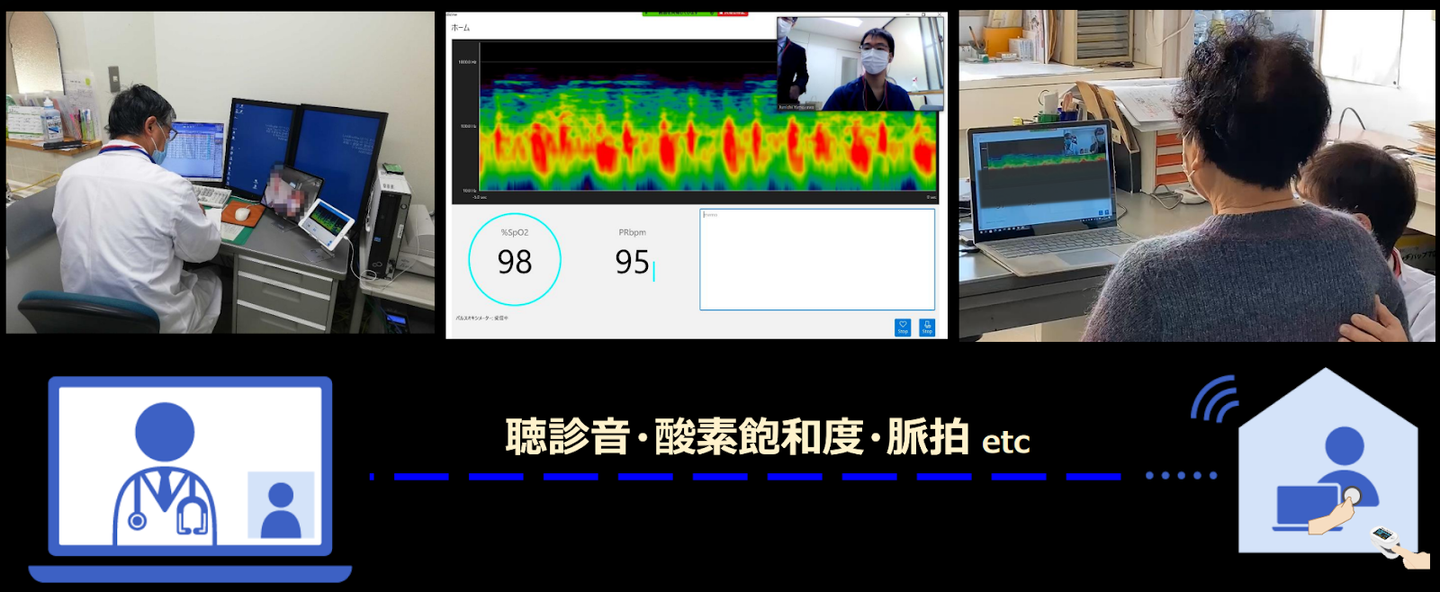 これらの問題を解決すべく、当社がクラウド健進®で得た知見を活かし、久木野診療所と水俣医療センターを「遠隔聴診対応ビデオチャットシステム」で繋いでオンライン診療を実施する実証事業を支援しました。
