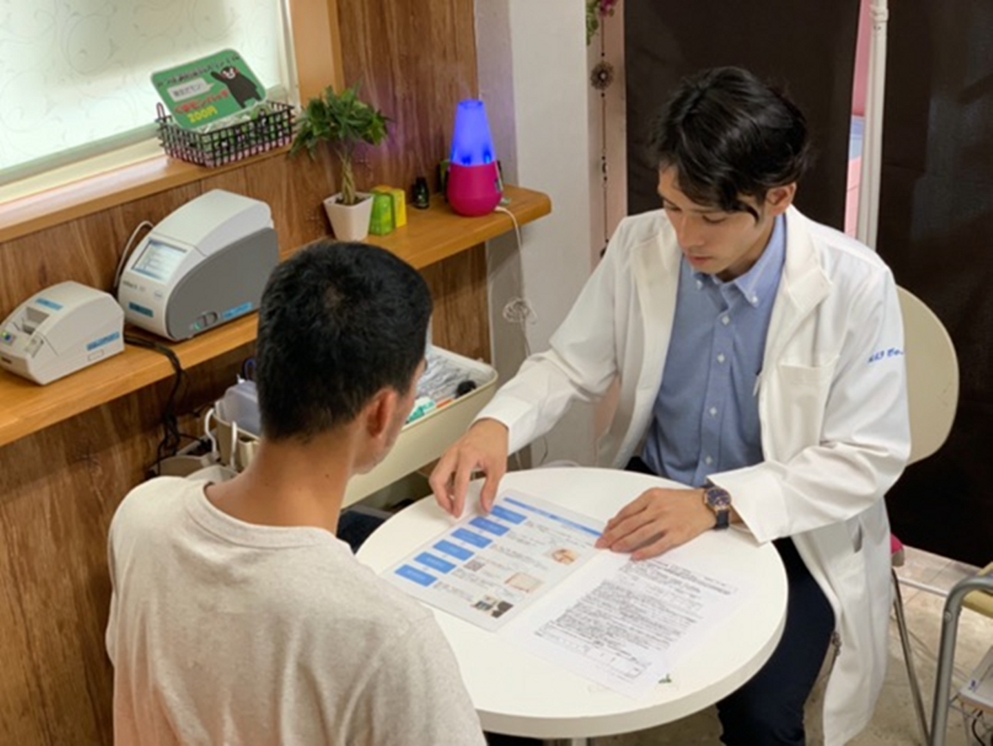 2018年度からの4年間、当社は遠隔医療を中心に水俣市からの委託事業に取り組んできました。2018年度〜2020年度は「遠隔システムを活用した予備健診実施実証事業〜クラウド健進®〜」という名称で、医療機関以外の場所でクラウド健進®︎を中心に行いました。クラウド健進®︎は、指先採血と遠隔聴診を組み合わせることにより特定健康診査(メタボ健診)と同項目の検査をリモート環境下で提供可能です。当社はこれまで、薬局や子育て支援施設、健康経営に興味を持つ企業等でサービスを実施してきました。