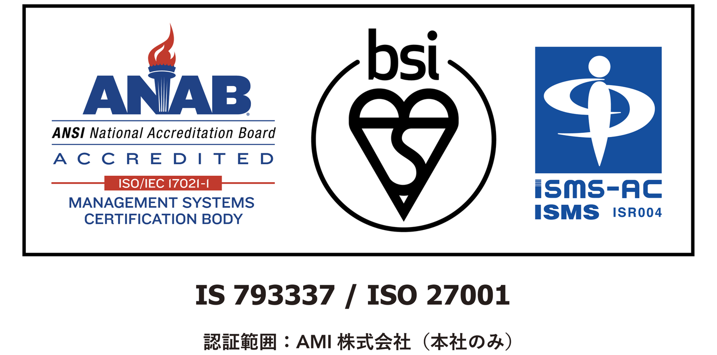 AMI株式会社は、2023年9月9日付けで、情報セキュリティマネジメントシステム(Information Security Management System: 以下「ISMS」)の国際規格である ISO/IEC 27001 : 2013 (JIS Q 27001 : 2014) の認証を取得したことを、お知らせします。