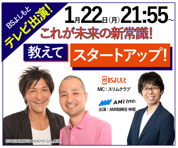 AMI株式会社 取締役の神尾が、2024年1月22日(月)21:55から放送のBSよしもと『これが未来の新常識!教えてスタートアップ!』に出演しました。