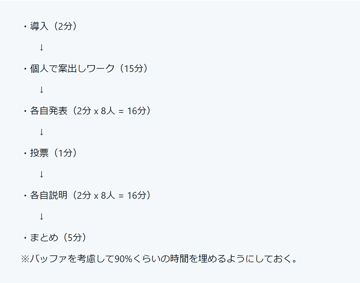 この段階でのポイントは、タイムキーピングをシビアに行い、時間内に収束まで確実に行うことです。ブレストは、どうしてもアイデア展開や発表に時間を取られがちなので、収束フェーズを経た明確なアウトプットがないまま時間いっぱいになってしまうことがあります。そうなると、その後は誰か個人が収束作業を巻き取ったりすることになり、結果的にメンバー間での合意形成がちゃんとされていない巻き取ったメンバーの独断と偏見で決めることになりかねません。また、そのリスクヘッジとして、それをメンバーに説明する余計な手間も時間も必要になってくることもあり、良いことがありません。何を、何人で、どうやって決めるかにもよりますが、そもそもの全体の時間の確保と時間配分を徹底して、時間内でアウトプットを出すようにすると有意義なワークショップになると思います。