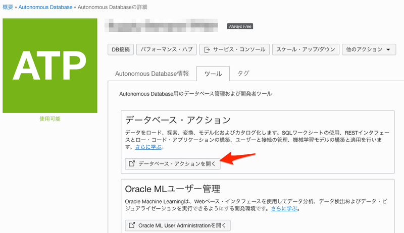 まずデータをインポートするATPを準備します。コンソールで対象のATPの詳細を表示し、ツールタブにあるデータベース・アクションを開くを押します。