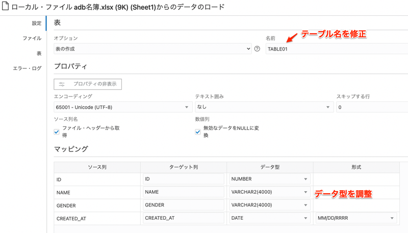 一番上にテーブル名があるので、これを修正しましょう。Excelファイルをアップロードした場合は、シート名がそのまま入っています。ですので、アップロードする前にシート名をテーブル名に修正しておけばこの手間を省けますね。あとは、無効データをNULL変換するかどうかや、データ型の修正をおこないます。データ型はアップロードされたファイルを見て自動で提案してくれるので、ほとんどの場合は何もしなくても期待するデータ型になっていると思います。