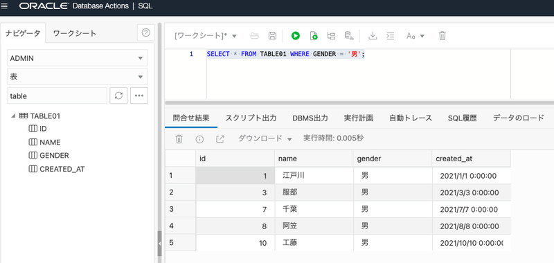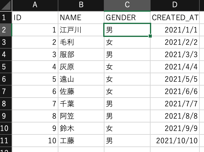 IDは数値、NAMEとGENDERは文字列、CREATED_ATは日付データが入っていますね。