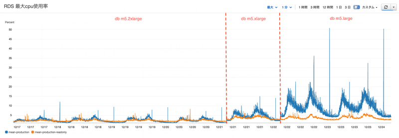 最終的にDBインスタンスを「db m5.2xlarge」から「db m5.large」までスペックダウンを行いました。