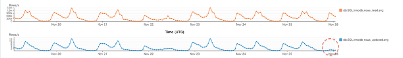 オレンジ色がSELECT、青色がUPDATEなので、対応前まではほぼ同じ波形になっていましたが、対応後青色の波形だけが消えています。