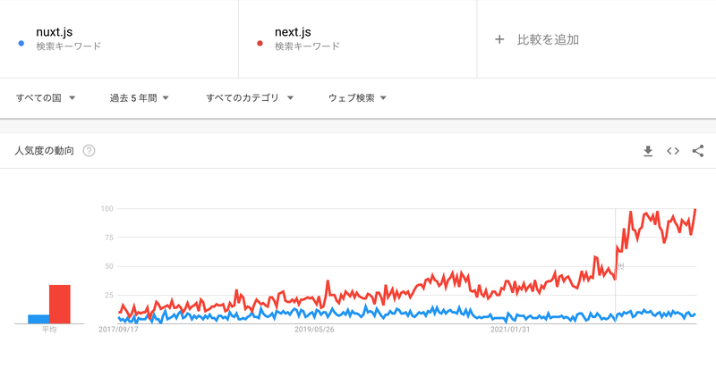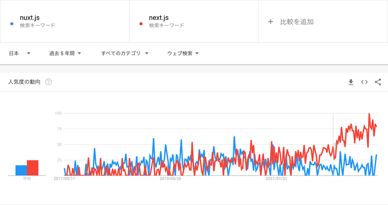 Google Trends: https://trends.google.co.jp/trends/explore?date=today%205-y&q=nuxt.js,next.js
