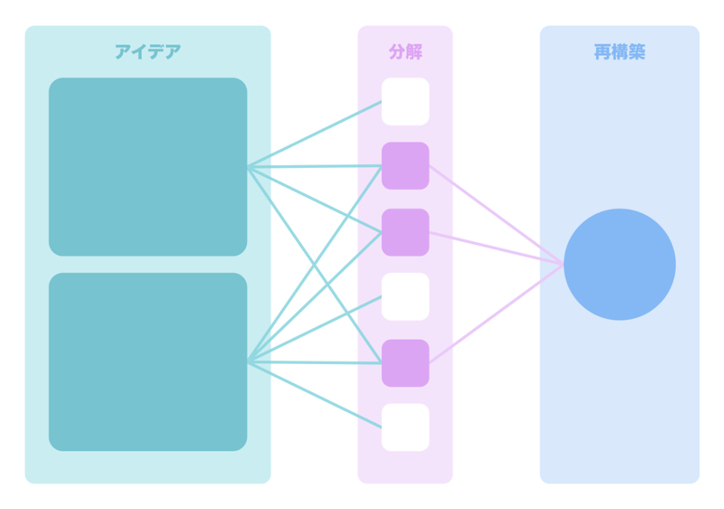 この段階でのポイントは、分解と再構築を行うことです。3案の文章を一度単語に分解し、同じ単語あるいは同じ意味合いの単語を見つけ出し、その共通の単語を使って文章を再構築しました。再構築したあとは、元の3案のひとつずつに立ち戻り、意味にブレがないか確認し、問題なければ最終化に進みます。このフェーズは、既に材料が出揃っているものを一度バラして組み上げ直す、といったワークなので、創造的でクリエイティブな0→1の思考よりも、バランスを取りながら既存のアセットを応用して最大化を図る1→10の思考が求められるワークにです。